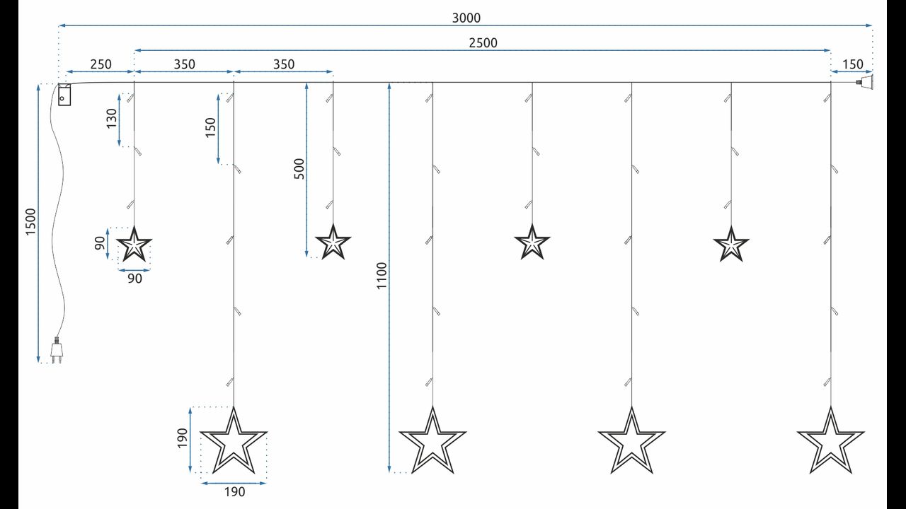 Zestaw lampek składa się z 4 wiszących gwiazd Led o wielkości 18,5 × 18,5 cm oraz 4 gwiazdek o wymiarze 9 × 9 cm. Długość girlandy wynosi 245 cm.
