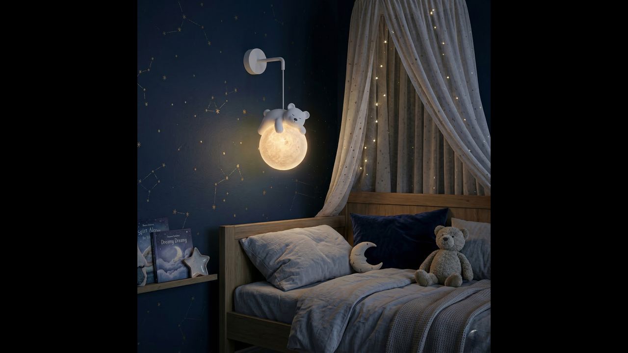 O aplică fermecătoare pentru copii, cu motivul unui ursuleț care doarme pe lună, este un corp de iluminat unic, creat special pentru camerele celor mici. Designul de poveste atrage atenția și introduce în interior o atmosferă caldă și liniștită, favorabilă calmării, relaxării și somnului. Este nu doar o sursă de lumină funcțională, ci și o decorațiune de perete spectaculoasă, care oferă încăperii un caracter primitor și magic.