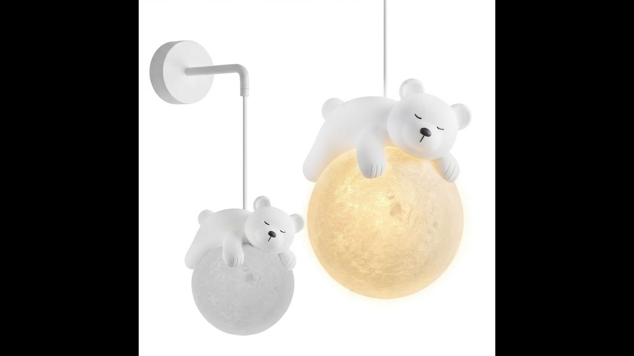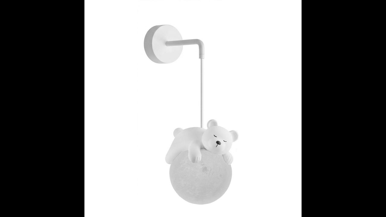 Abajurul lămpii este proiectat sub forma unei luni rotunde, cu o suprafață texturată care, atunci când este iluminată, imită subtil aspectul lunii adevărate. Pe partea sa superioară se odihnește un ursuleț care doarme cu ochii închiși, adăugând delicatețe și un farmec excepțional întregului ansamblu. Culoarea deschisă și formele moi, rotunjite, fac ca aplica să se integreze perfect în amenajările pentru copii și să creeze un climat prietenos în interior.