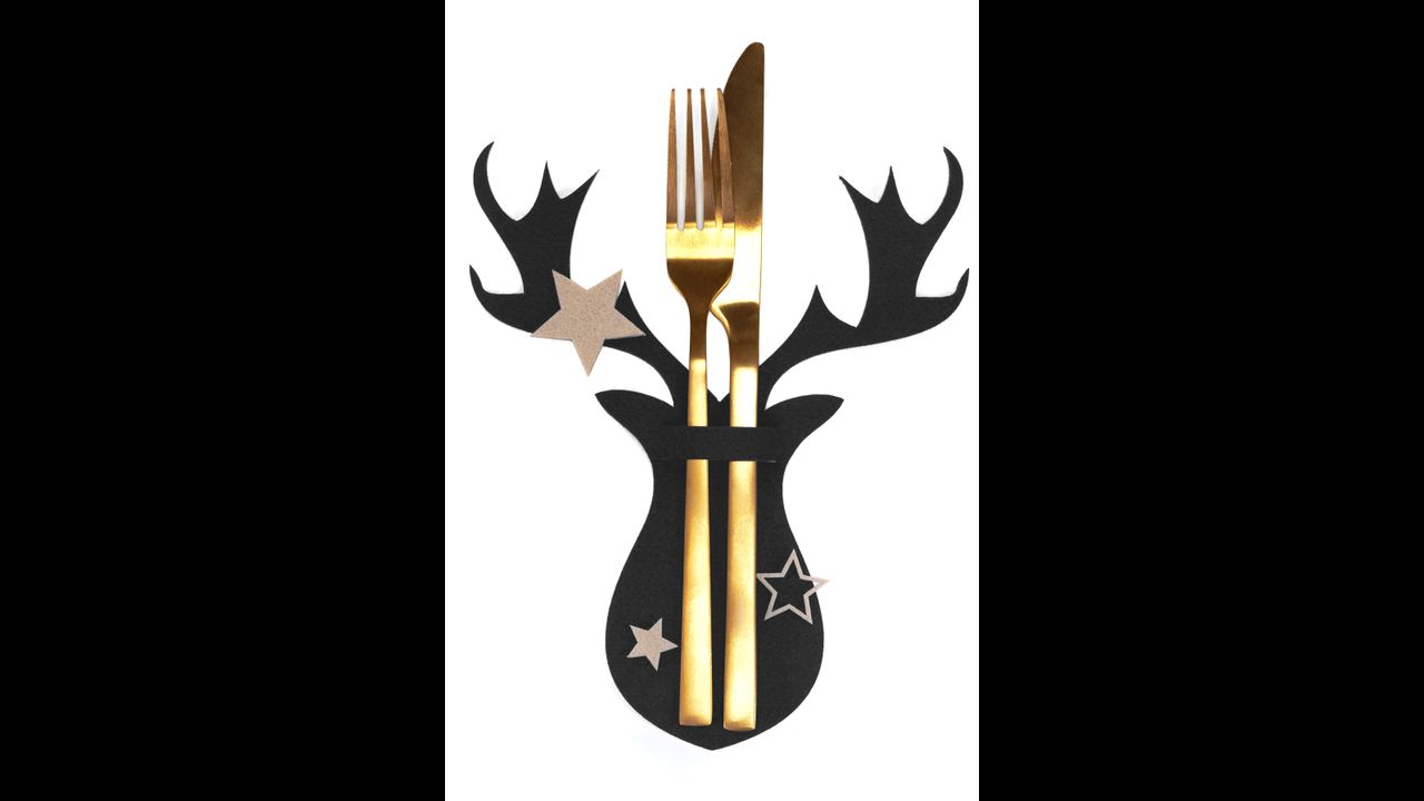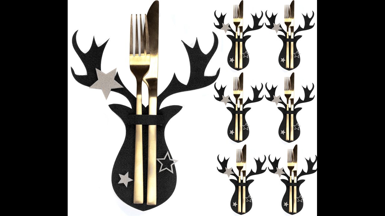 Piękne czarne pokrowce na sztućce z motywem renifera. Piękna dekoracja do domu na okres świąteczny. Będą wyjątkowym wykończeniem stołu wigilijnego